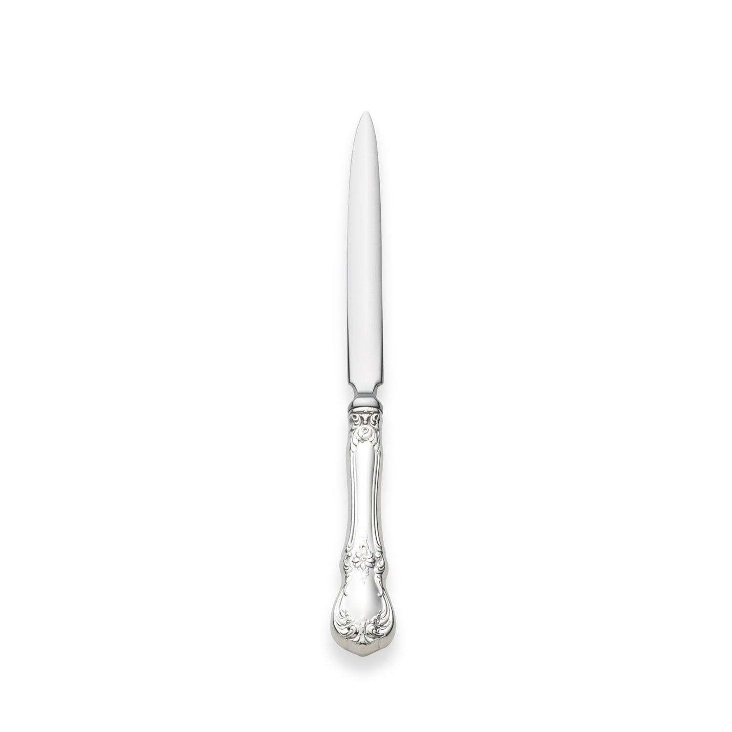 The Towle Old Master Sterling Silver Letter Opener features elegant scrollwork and a sculpted handle inspired by Baroque design — a refined accessory for traditional desks. 7-3/4" long.